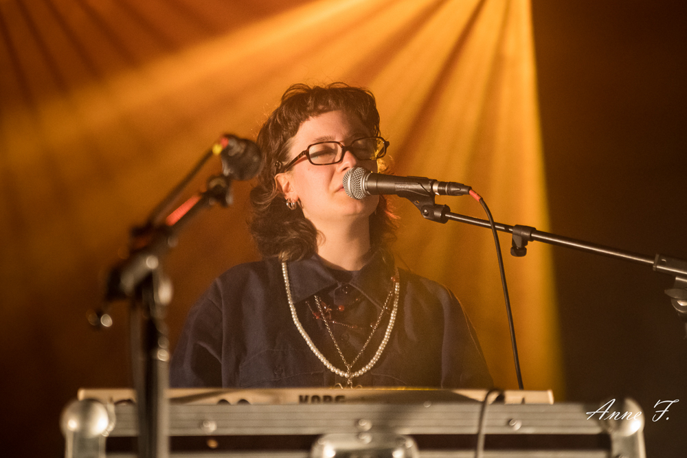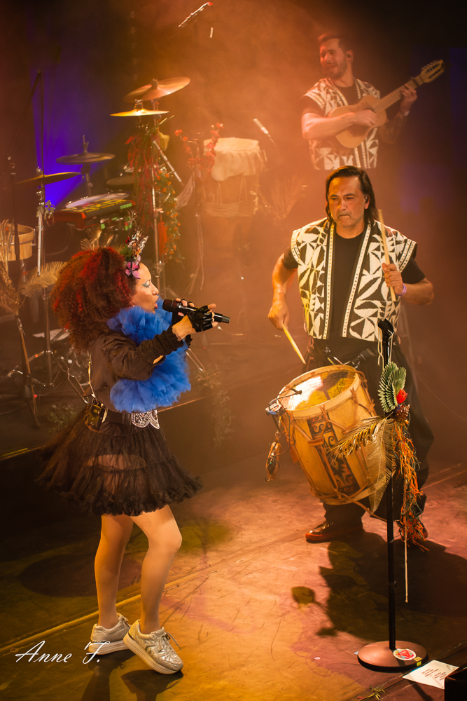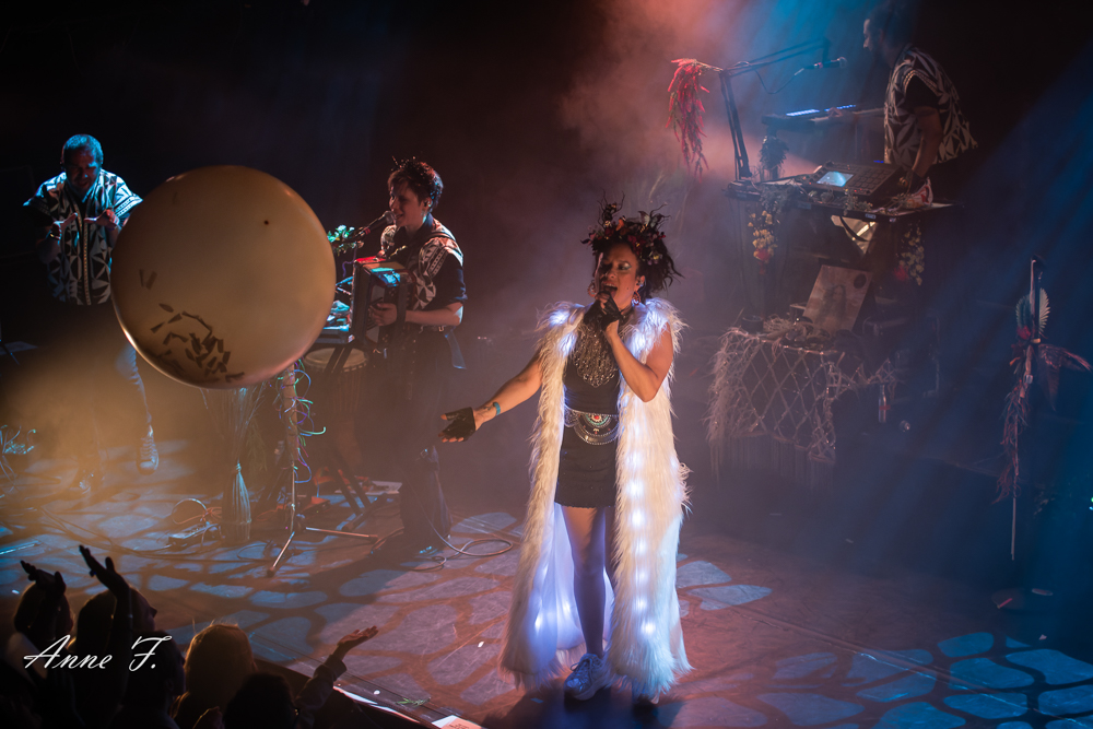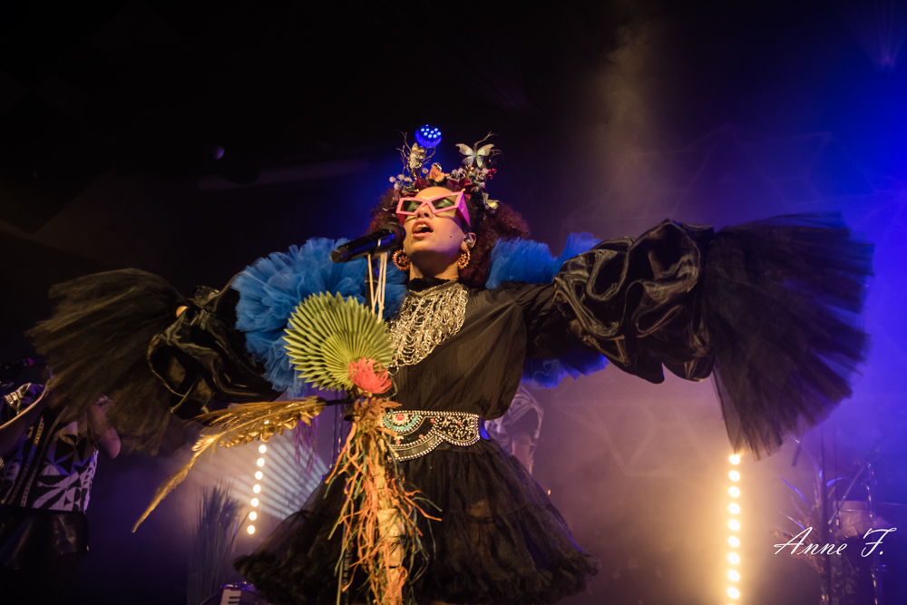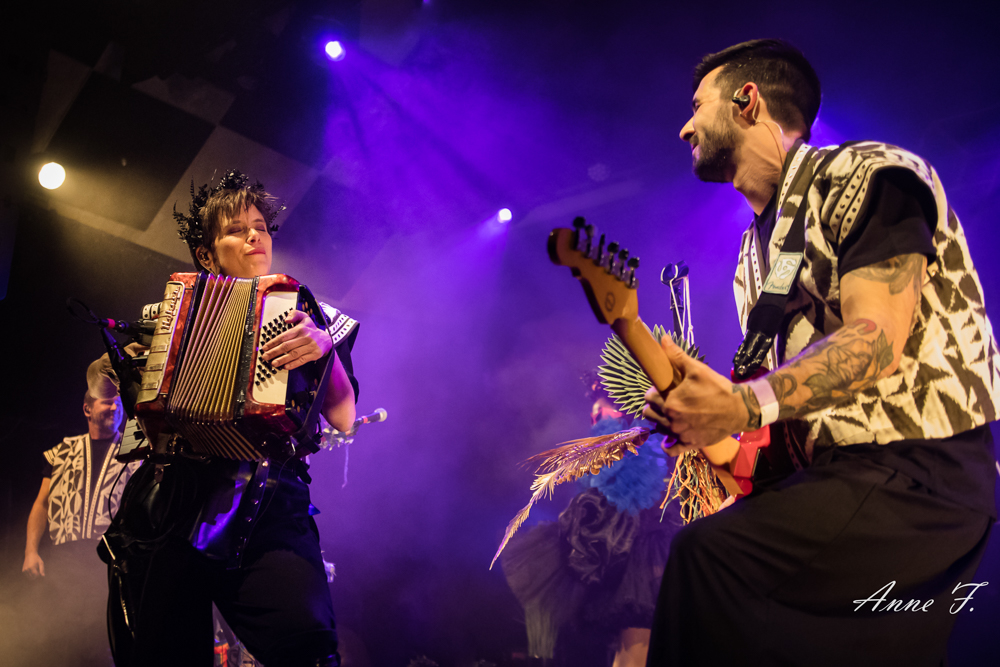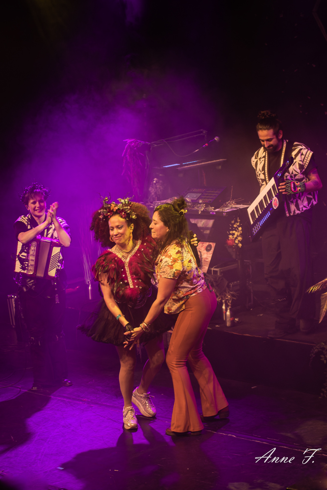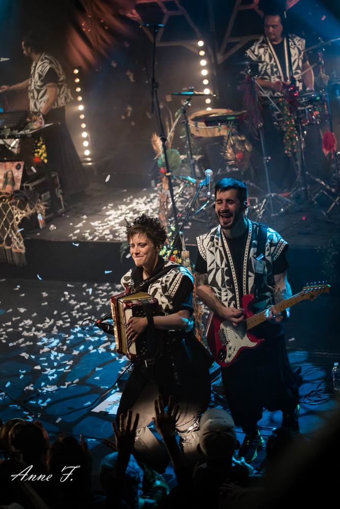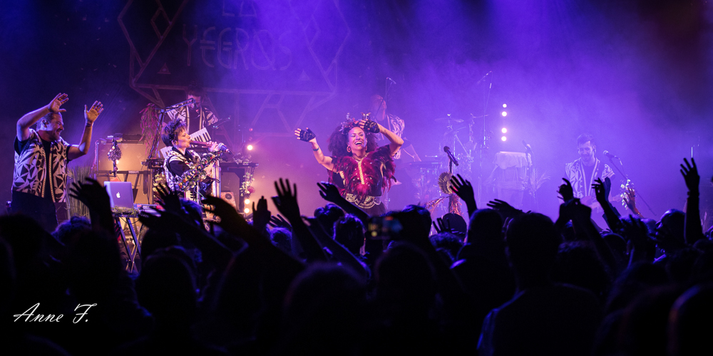 Le public attend avec impatience la Yegros, venue d’Argentine et sa Cumbia survitaminée aux influences Electro, Hip-hop ou Funk. Sur la scène, les diverses percussions, claviers, accordéon ou guitares prennent place. L’artiste impose d’emblée une présence charismatique et ne laisse aucun temps mort. Très vite, dans la fosse et sur la mezzanine, ça danse, ça saute au son des des rythmes puissants des musiciens qui jouent avec complicité et sourires aux lèvres. La Yegros embrase totalement la salle dans une scénographie aux couleurs flamboyantes. Des ballons et confettis viennent rajouter à la fête pour le plus grand plaisir des spectateurs.