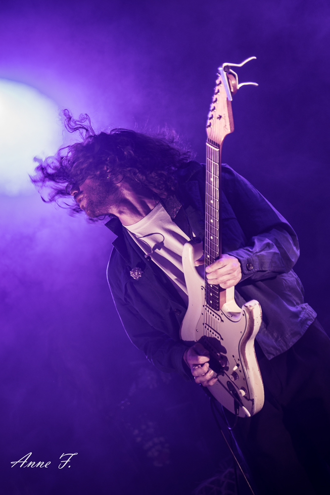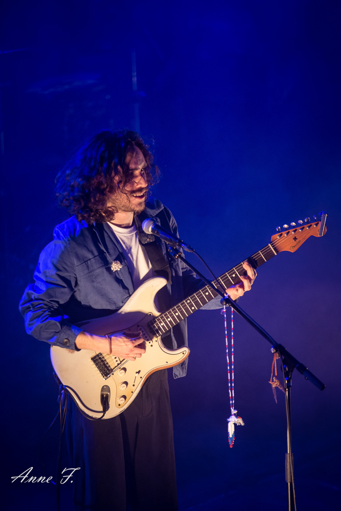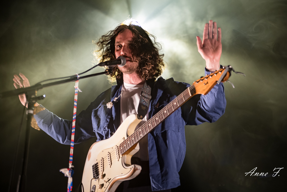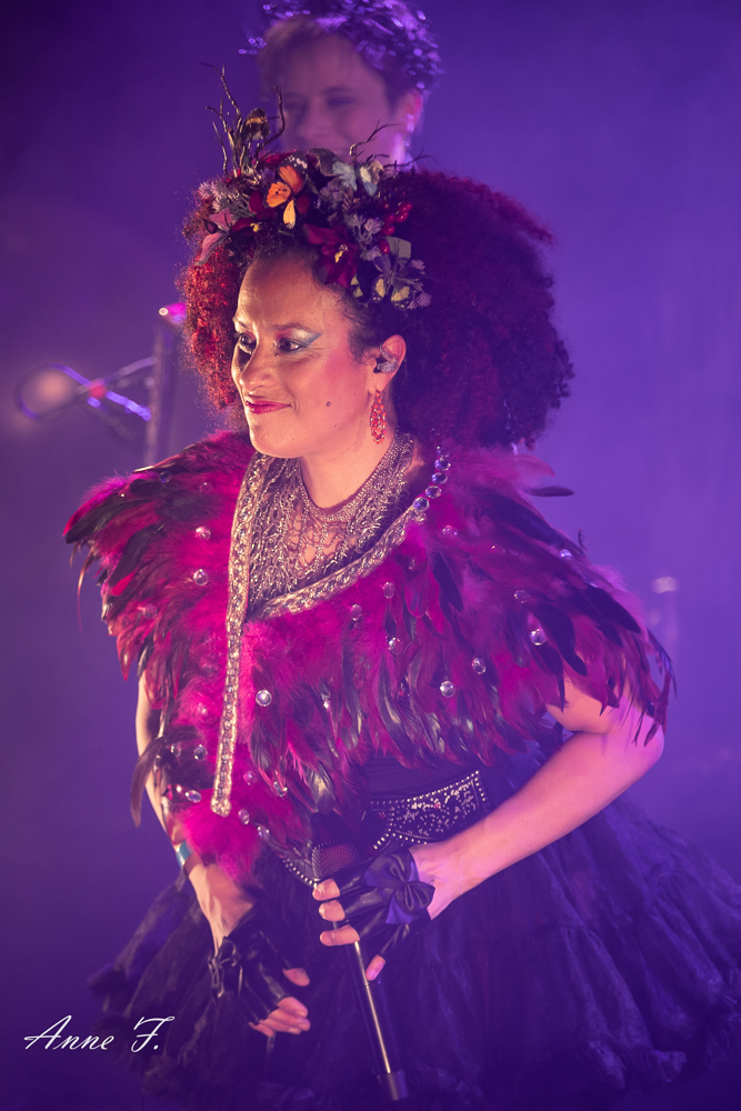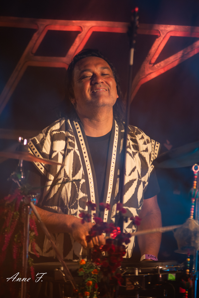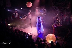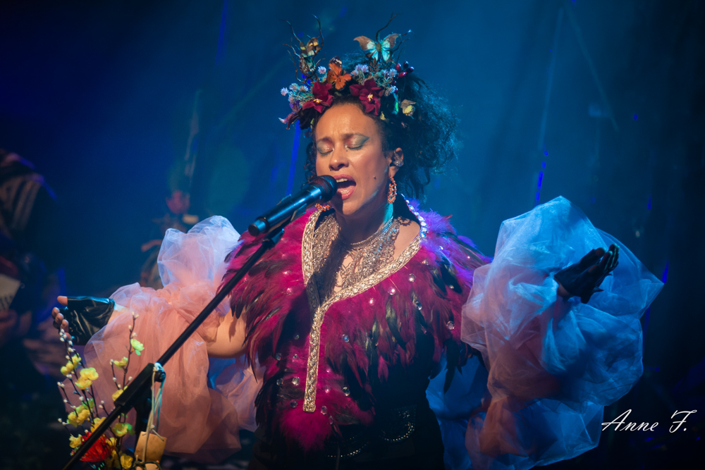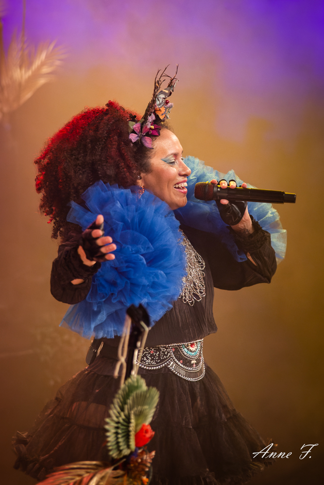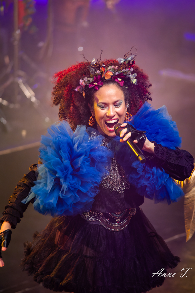 Le public attend avec impatience la Yegros, venue d’Argentine et sa Cumbia survitaminée aux influences Electro, Hip-hop ou Funk. Sur la scène, les diverses percussions, claviers, accordéon ou guitares prennent place. L’artiste impose d’emblée une présence charismatique et ne laisse aucun temps mort. Très vite, dans la fosse et sur la mezzanine, ça danse, ça saute au son des des rythmes puissants des musiciens qui jouent avec complicité et sourires aux lèvres. La Yegros embrase totalement la salle dans une scénographie aux couleurs flamboyantes. Des ballons et confettis viennent rajouter à la fête pour le plus grand plaisir des spectateurs.