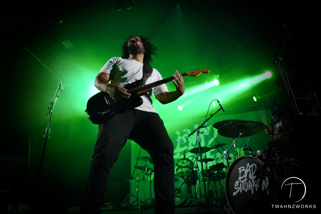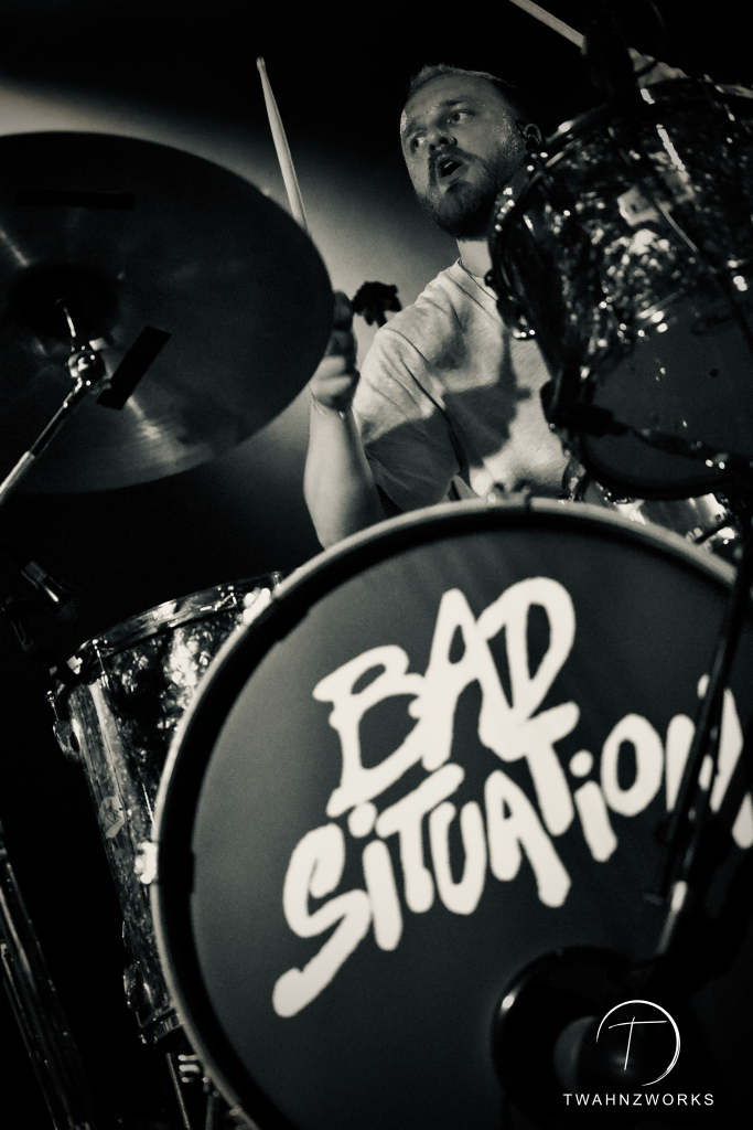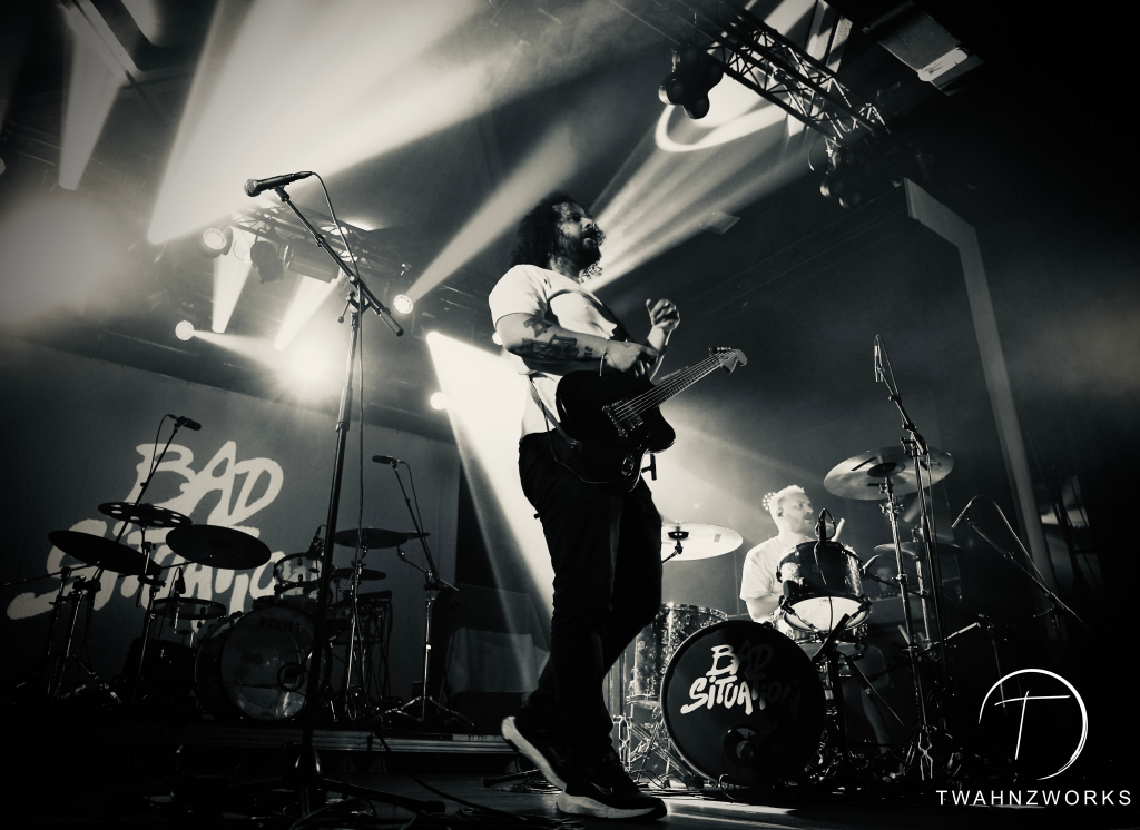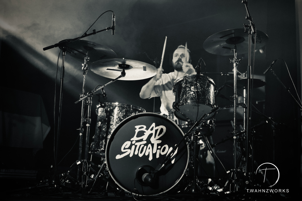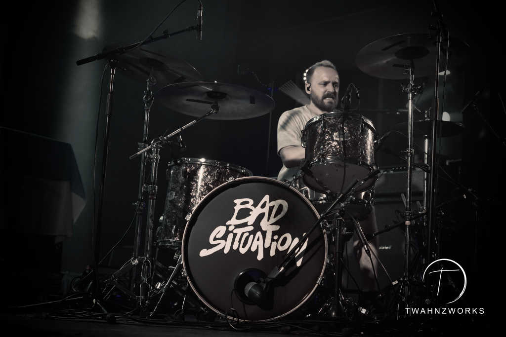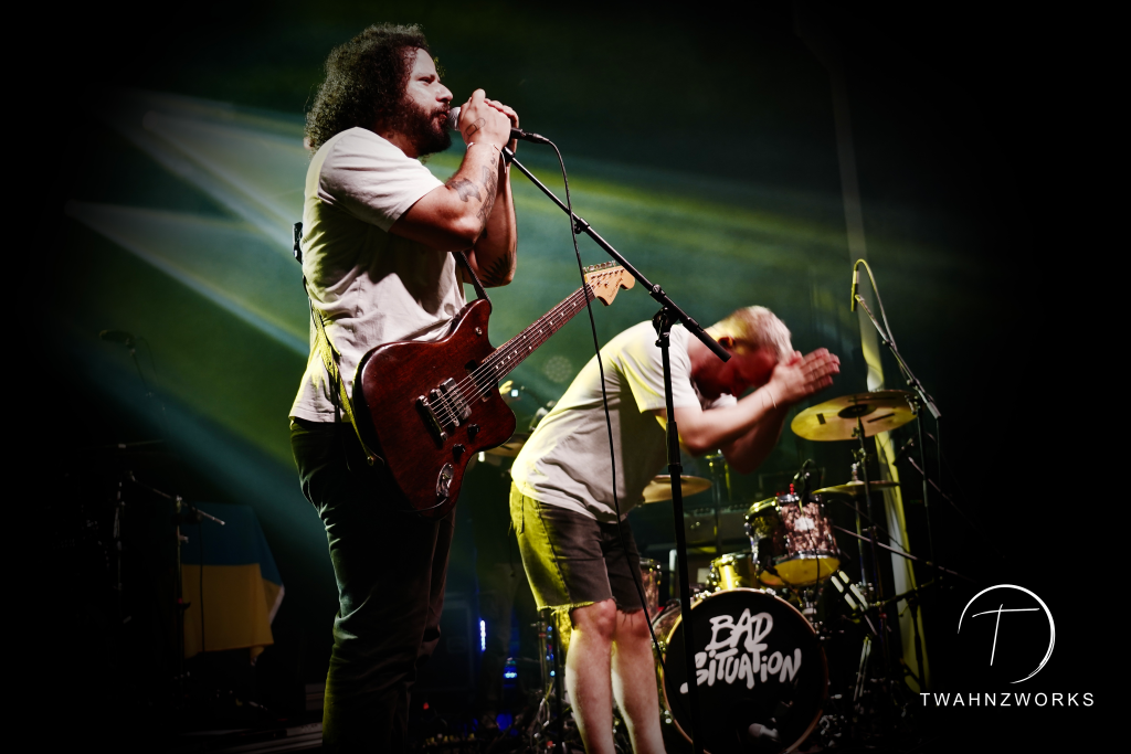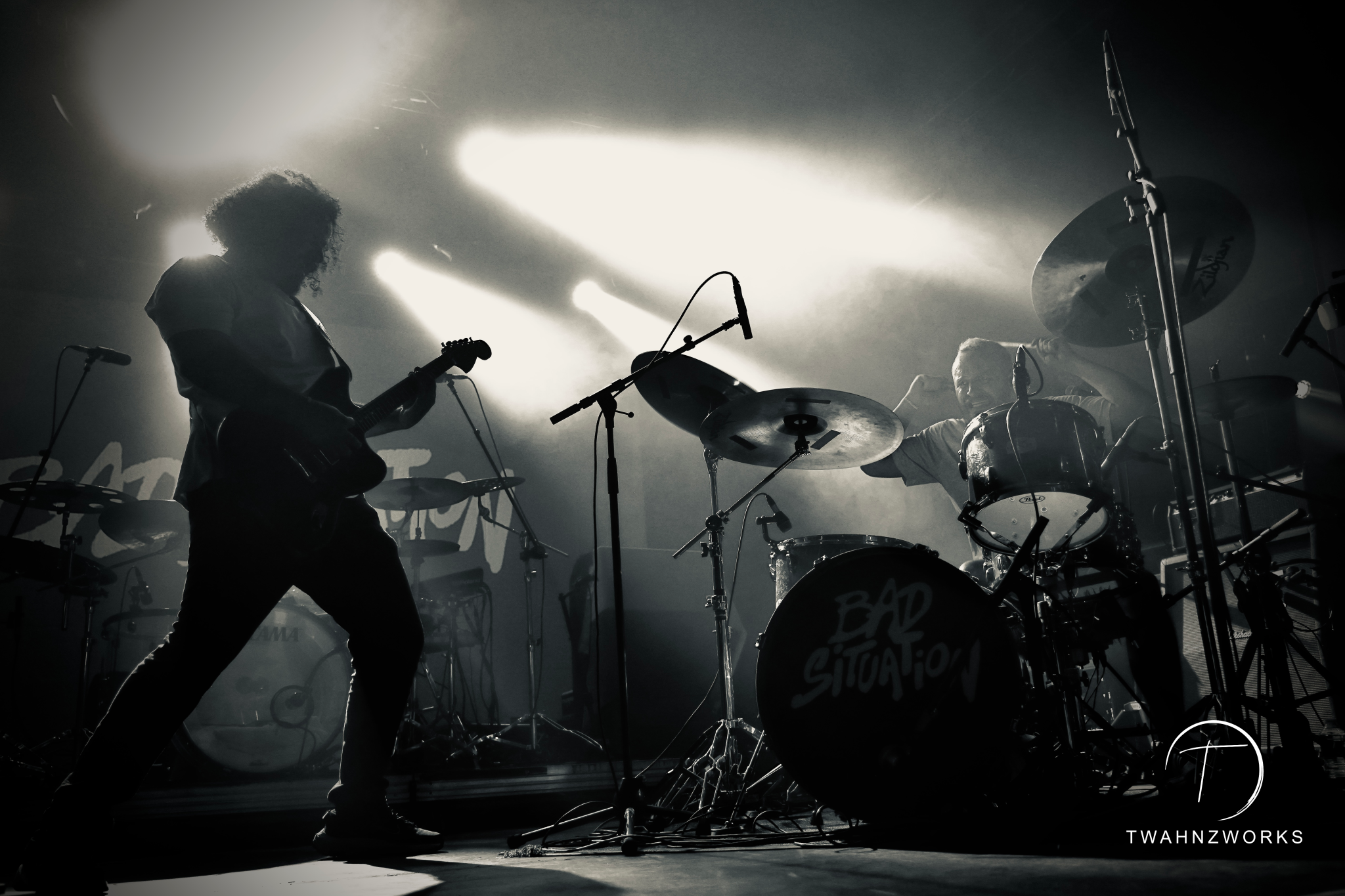 Dès les premières minutes, le duo impose une présence sonore massive qui dépasse largement sa formule minimaliste guitare abrasive, batterie tendue et chant habité : Bad Situation ne cherche pas à arrondir les angles. Le groupe délivre un Rock brut, frontal, qui rappelle l’urgence des formations alternatives des années 90 tout en conservant une identité actuelle. Sur scène, l’énergie est immédiate. Les morceaux s’enchaînent sans temps mort, portés par une rythmique sèche et des riffs qui frappent fort.